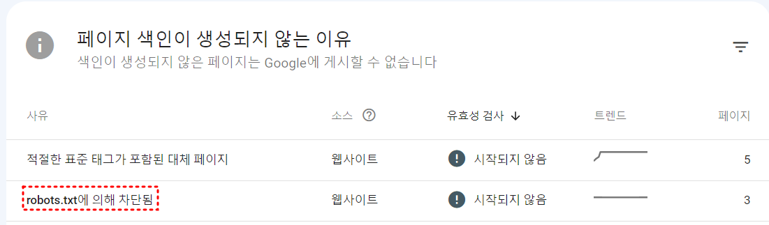 구글 서치콘솔로 입장 ▶ 페이지 클릭 ▶ robots.txt에 의해 차단됨 에러 메시지를 클릭합니다.