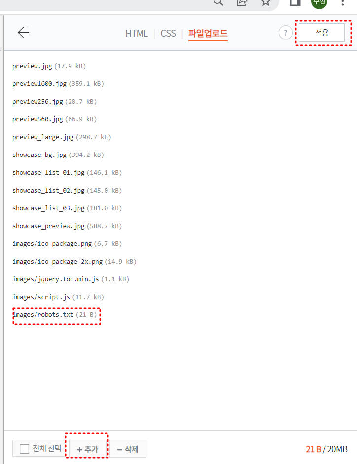 다운로드된 파일을 티스토리 관리 페이지▶ html편집 ▶ 파일업로드로 입장하여 robots.txt파일을 첨부해 줍니다.