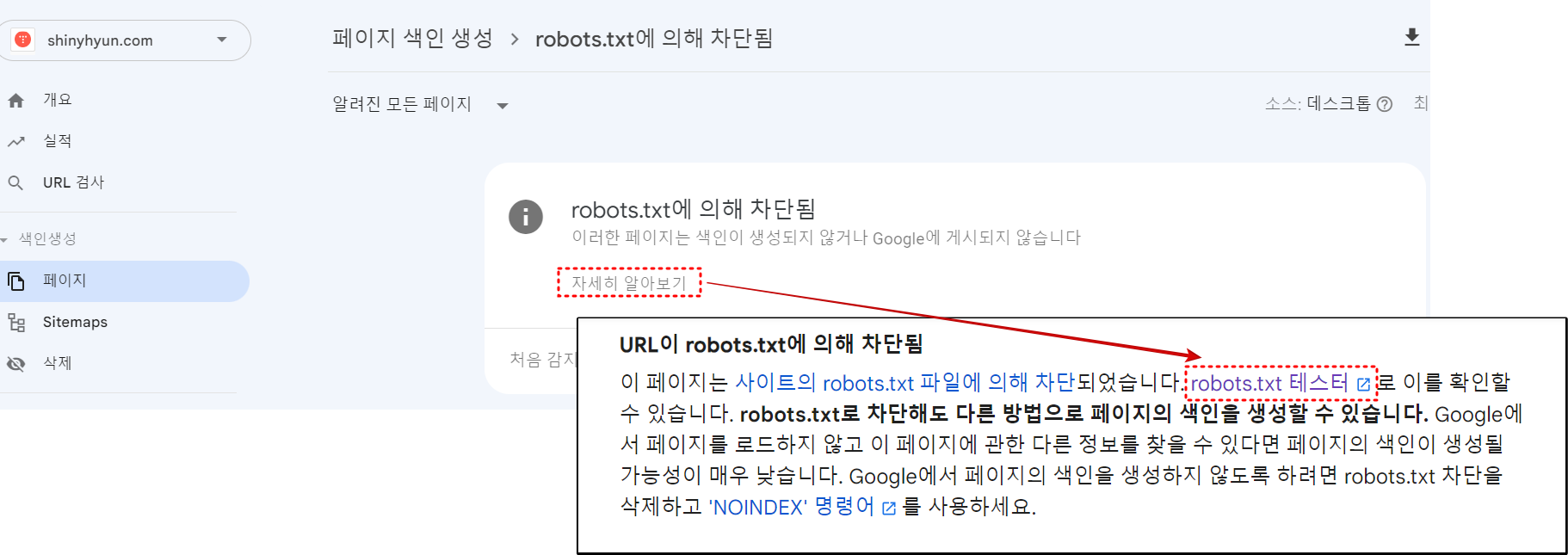 여기서 "자세히 알아보기"를 클릭하면 "URL이 robots.txt에 의해 차단됨"이라는 메시지가 생성됩니다.