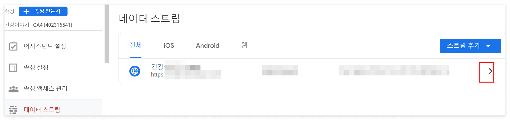 속성에서 데이터 스트림을 클릭하면 데이터 스트림 관련 정보가 열립니다.
