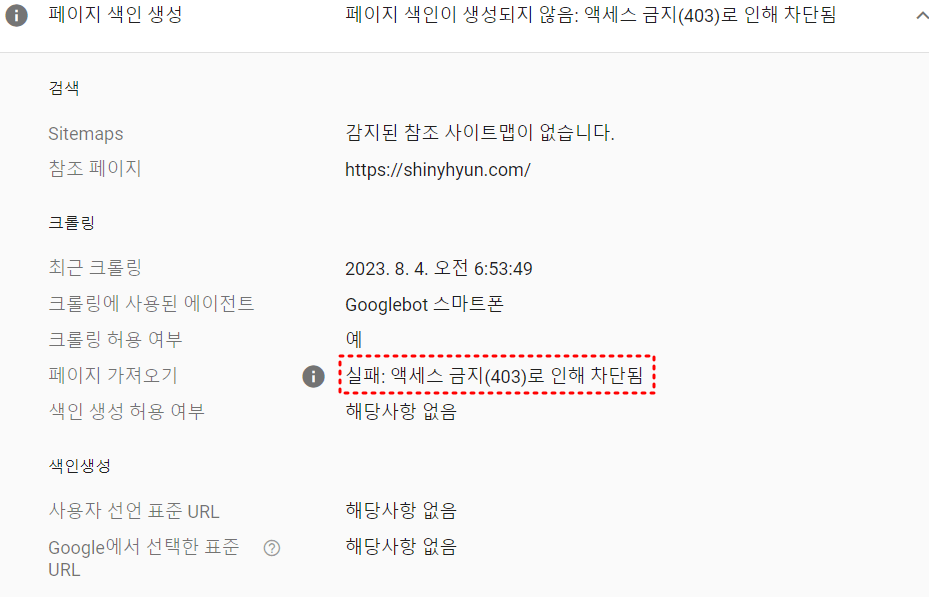 구글 서치콘솔을 확인하던 중 구글 403 오류가 생겼다는 것을 알게 되었습니다.