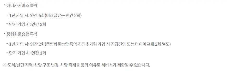 - 긴급견인 : 운행불가 시 1일 1회 한하여 10km 이내 가까운 정비소까지 견인합니다.(초과 시 본인부담)