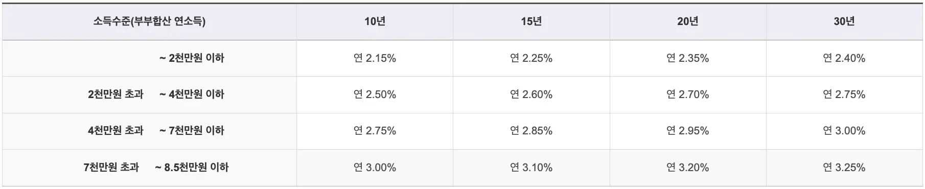 | 7천만원 초과 ~ 8.5천만원 이하 | 연 3.00% | 연 3.10% | 연 3.20% | 연 3.25% |