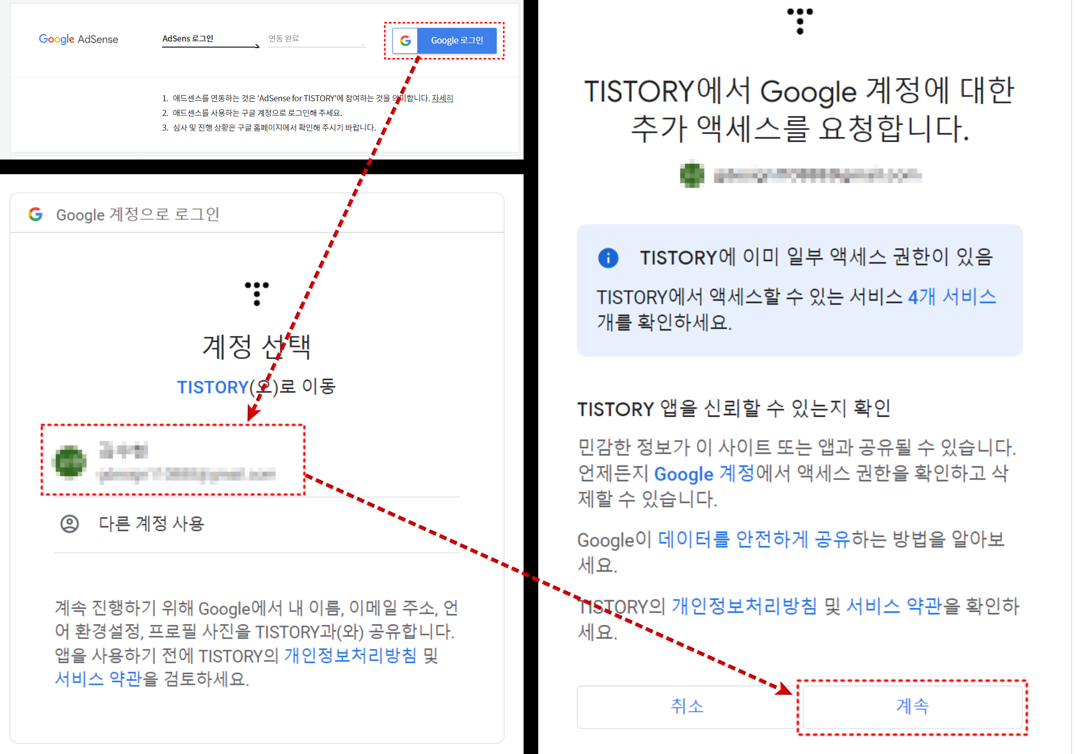 여기서 구글 계정을 클릭해 주면 추가 액세스 요청화면에서 계속을 클릭해 주면 연동작업이 완료됩니다.