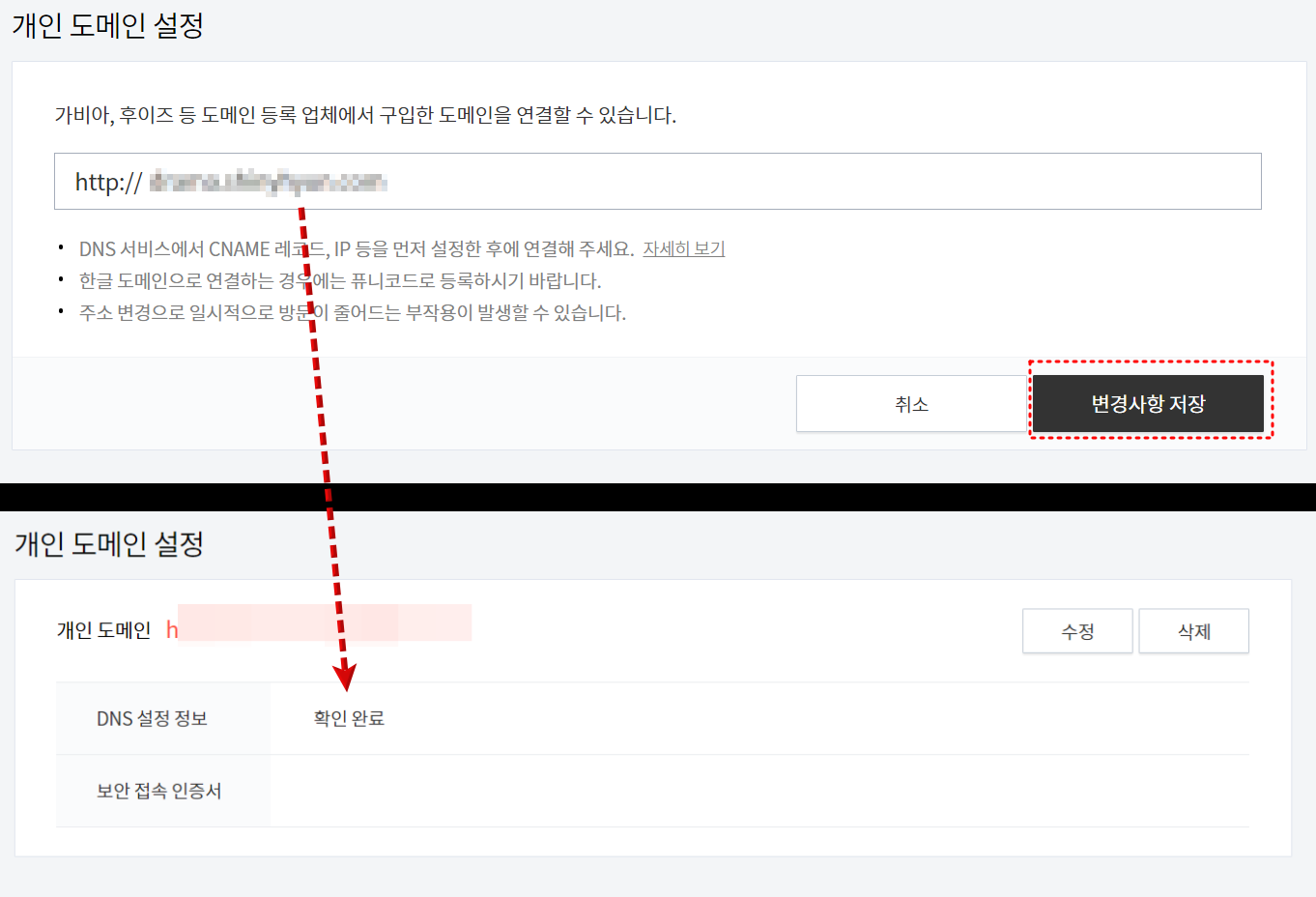 저장이 되면 개인도메인 주소가 빨간색으로 표시되고 DNS 설정정보가 확인완료로 표시됩니다.