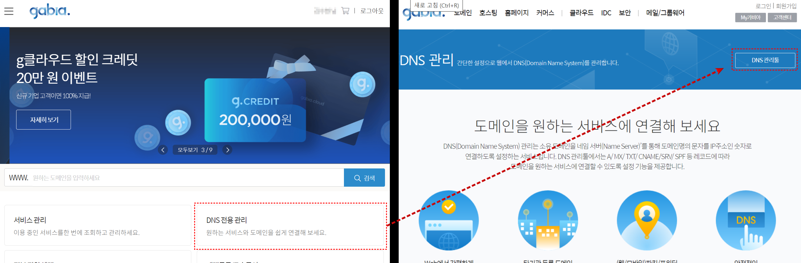 로그인을 하면 DNS전용관리 ▶ DNS관리툴을 클릭해 줍니다.