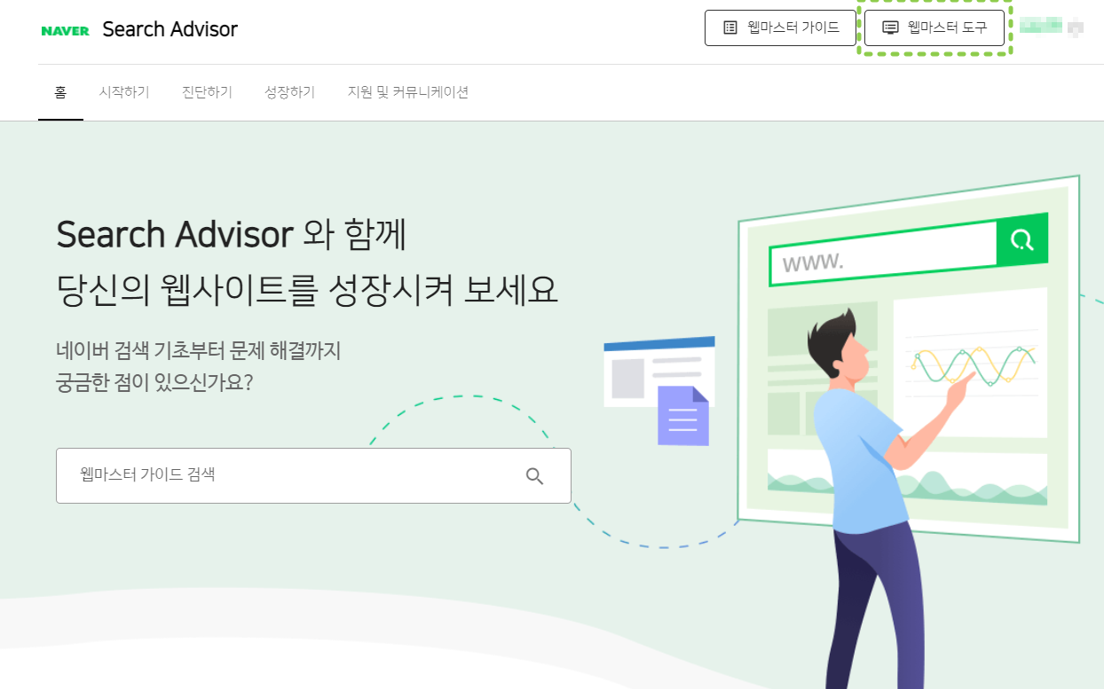 네이버에서 서치어드바이저를 검색하여 네이버 서치어드바이저로 입장, 웹마스터 도구를 클릭해 줍니다.