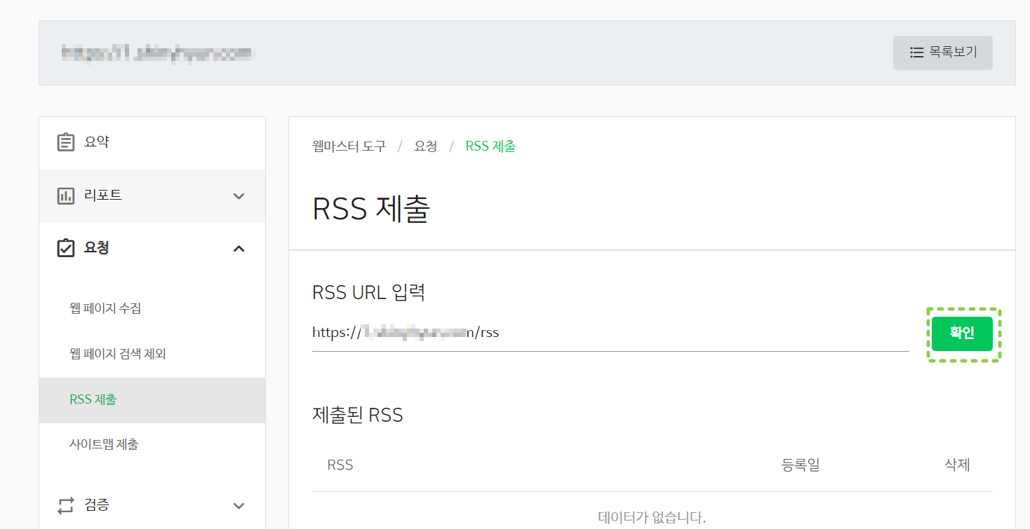 작성 후 확인을 누르면 정확히 하단에 rss 제출이 완료되었다는 메시지가 생성됩니다.