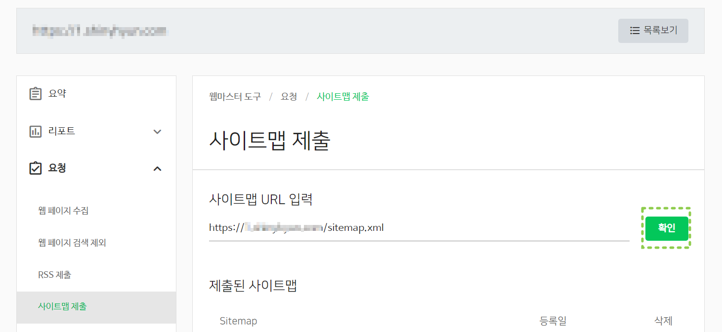 rss제출과 같이 https://xxx.tistory.com/sitemap.xml을 입력 후 확인을 클릭해 줍니다.