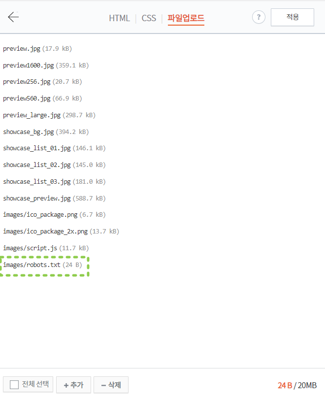 하단의 추가버튼을 누르고 다운로드한 rotots.txt파일을 업로드해 줍니다.