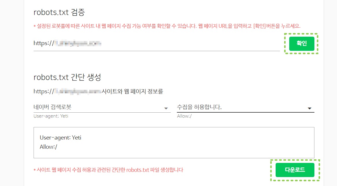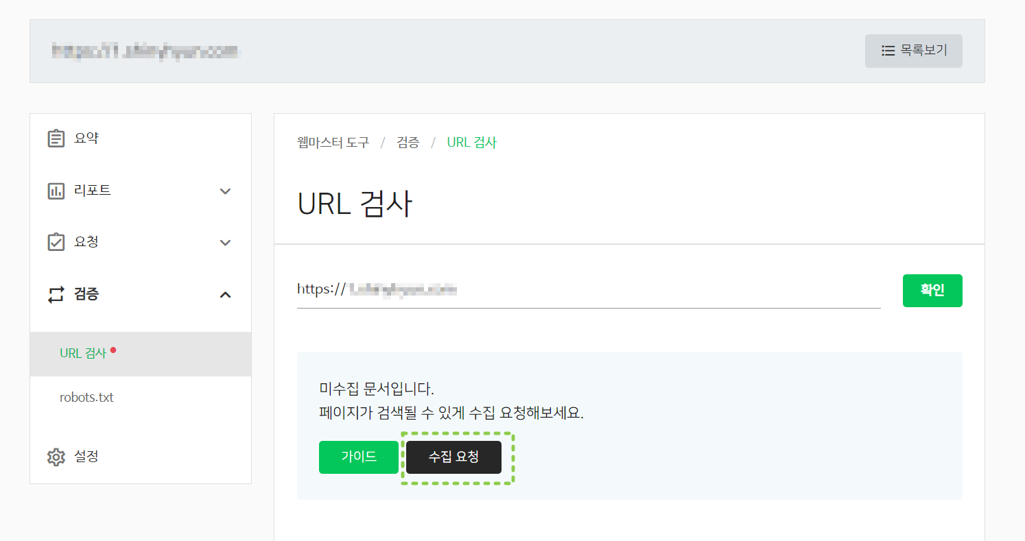검증 ▶ rotots.txt를 클릭하면 하단과 관이 rotots.txt 수집요청 버튼이 보입니다.