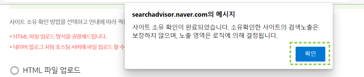 네이버 서치 어드바이저에서 소유권 확인이라는 버튼을 클릭하면 아래와 같이 소유권 확인 메시지가 뜹니다.