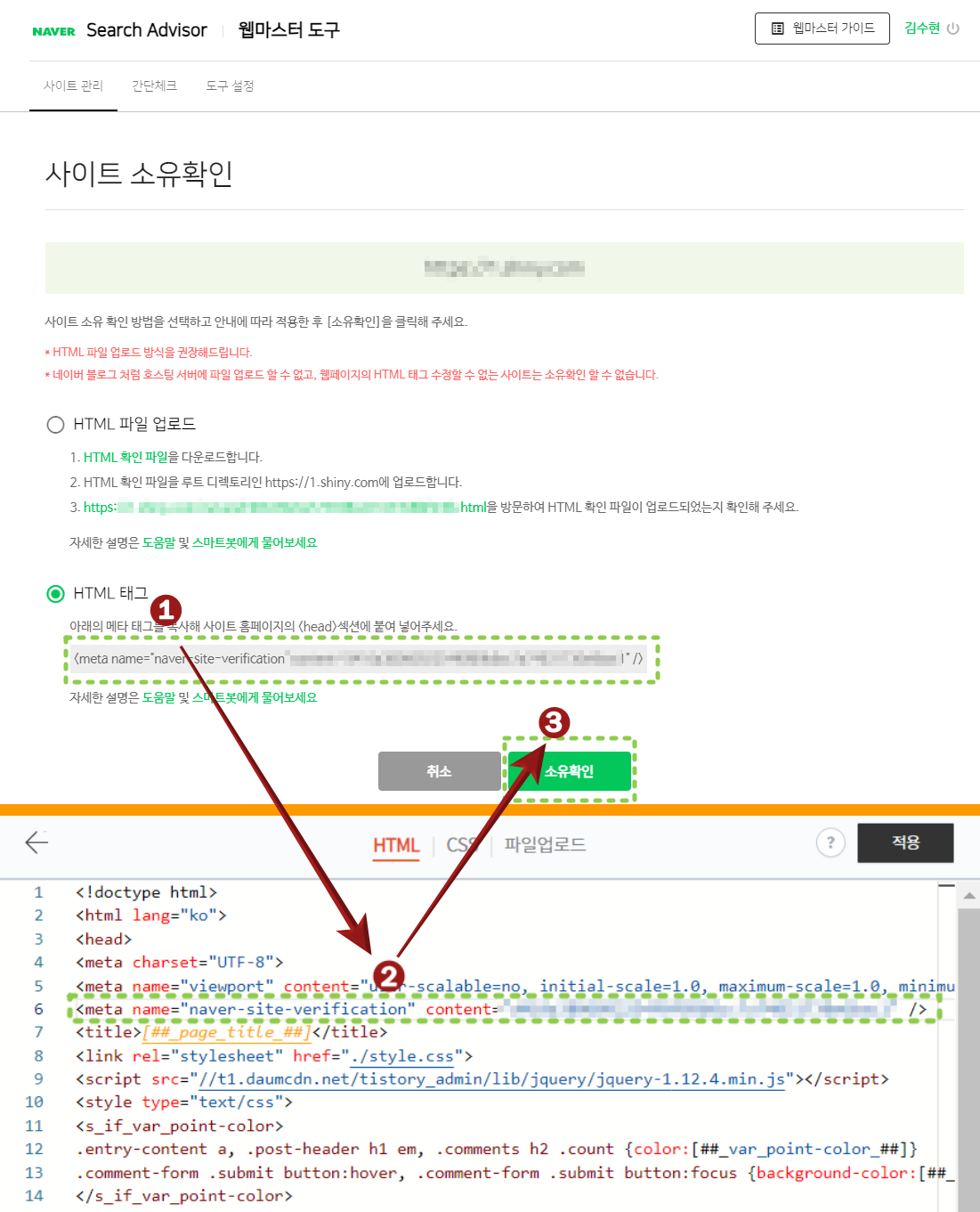 위와 같이 네이버 서치어드바이저에서 복사한 메타테그를 티스토리에 복사해 줍니다.