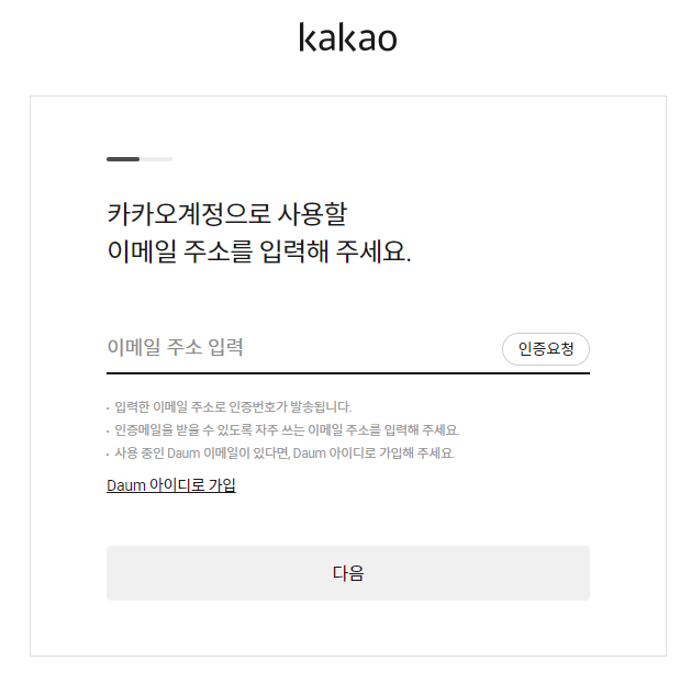 카카오 계정으로 사용할 이메일 주소에서 우리가 구글계정으로 만들었던 구글 이메일 주소를 입력해 줍니다.