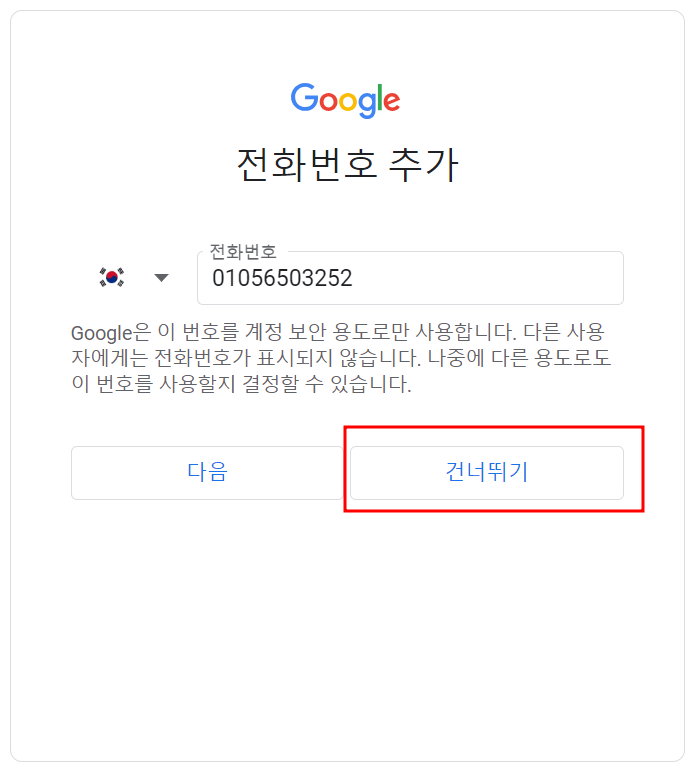 구글에서 전화번호 추가창이 열리면 건너뛰기를 해주세요. 그럼 기록에 남지 않습니다.