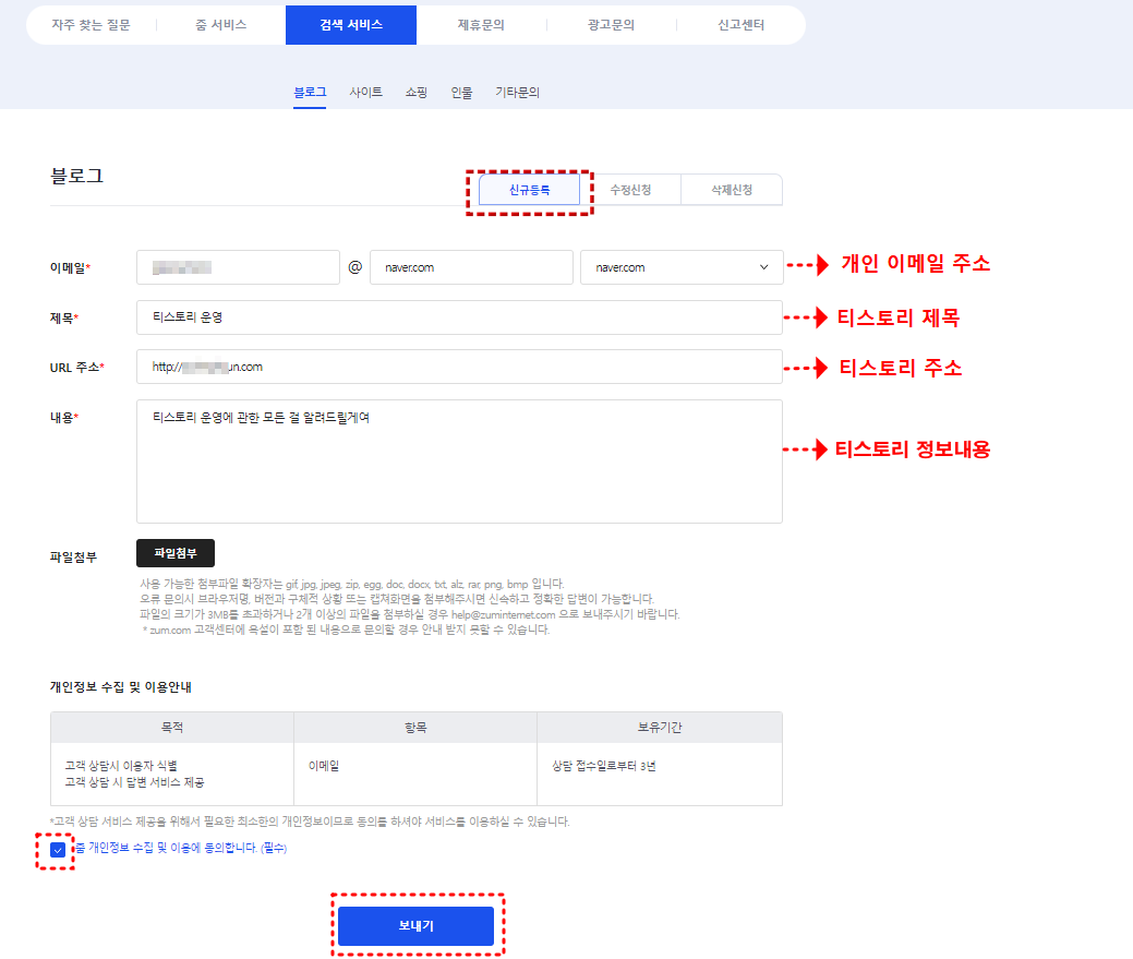 하단 개인정보 수집에 체크해 주시고 보내기를 클릭해 주시면 줌 검색등록이 완료됩니다.