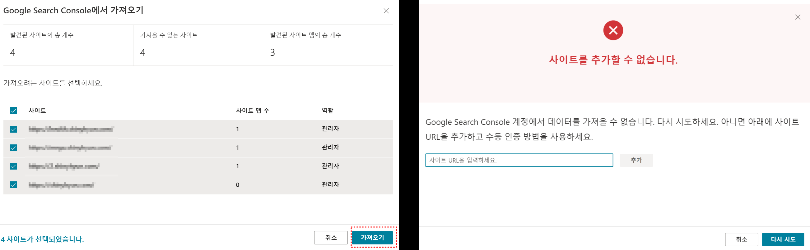 GCS에서 사이트를 가져오기를 하였더니 사이트를 추가할 수 없습니다라는 메시지가 뜨네요.