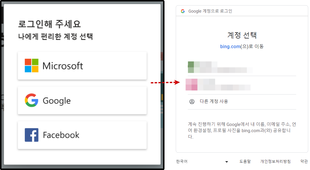 계정화면이 보이고 그중 하나를 클릭하면 bing.com에서 Google계정에 액세스 하려고 합니다라는 화면이 보입니다.