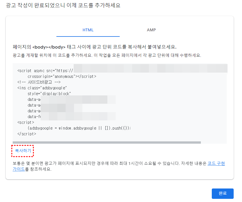 이 광고코드를 복사하면 2단계 완료입니다.