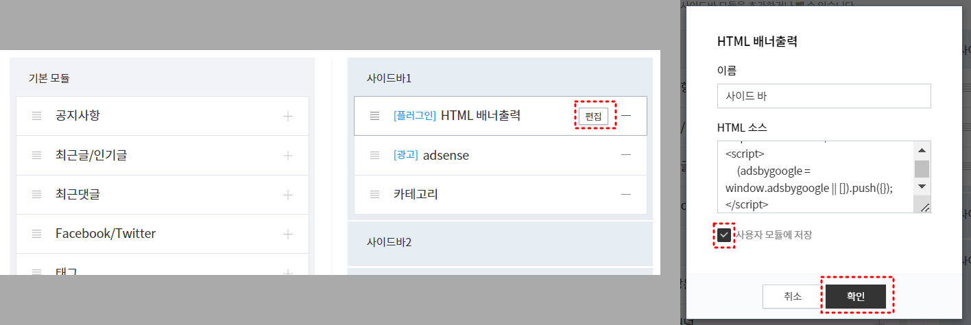 상단 이미지같이 사용자 모듈에 플러그인 사이드바가 새로 생성됐고 변경사항 저장을 클릭해 주면 사이드바 광고출력 세팅이 모두 완료됩니다.