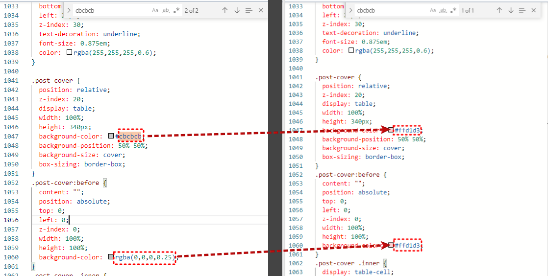 그중 두 번째 cbcbcb를 찾아 post-cover과 post-cover : before의 색상을 대략 1000번대에 있고 여기서 cbcbcb는 회색을 의미합니다.
