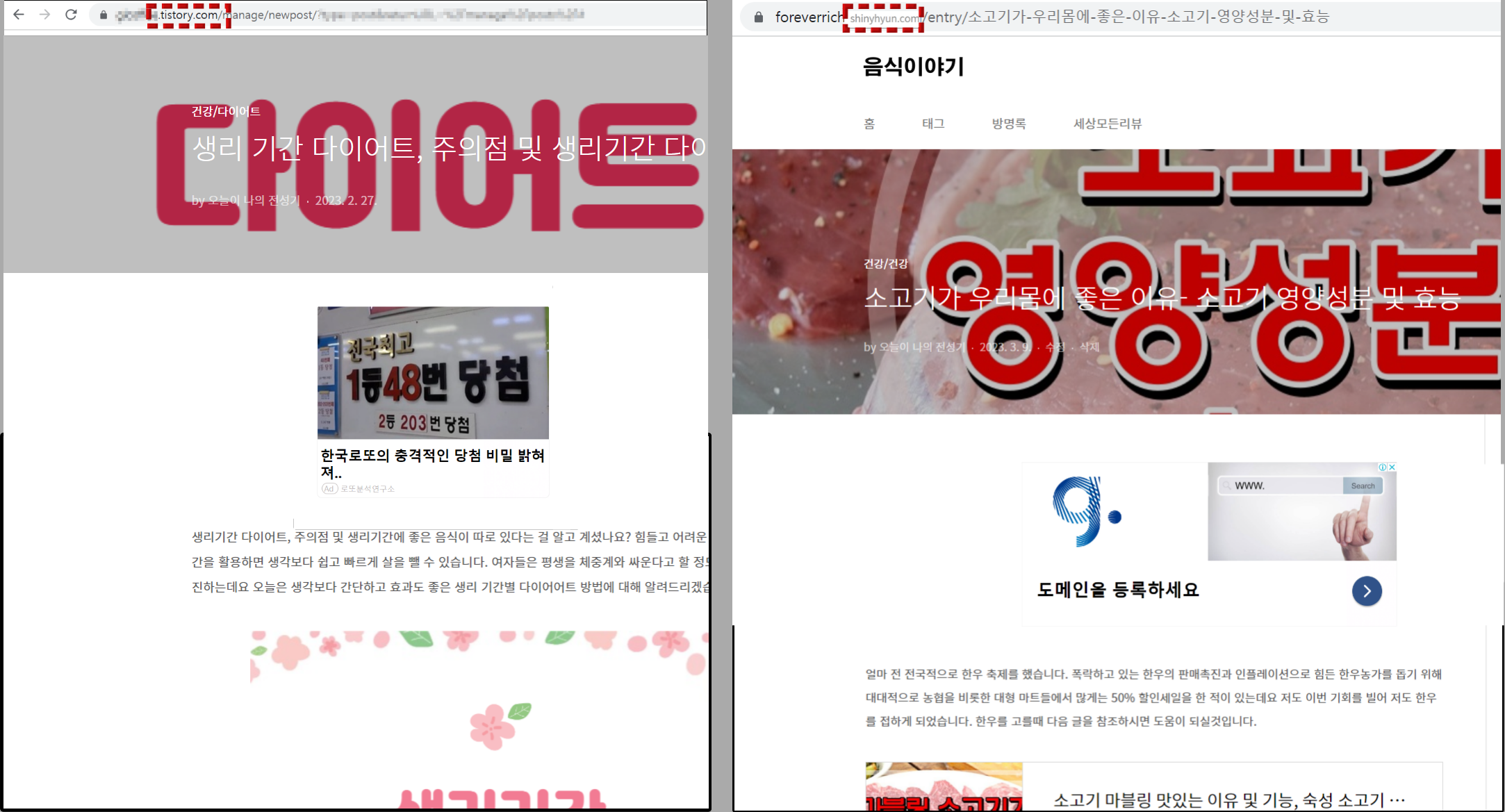 좌측은 티스토리 자체블로그로 URL이 OOO.tistory.com으로 끝나고 우측은 도메인을 씌워 승인받은 블로그로 개인도메인. com으로 끝나는 것을 볼 수 있습니다.