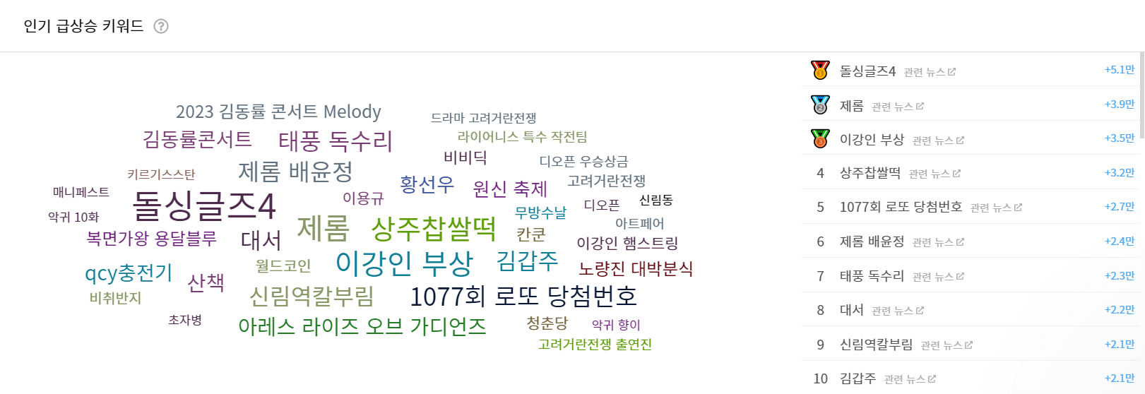 아래는 인기 급상승키워드입니다. 글감의 바닥을 느꼈을 때 이곳을 방문해 급상승 키워드를 이용해 글을 쓰곤 합니다.