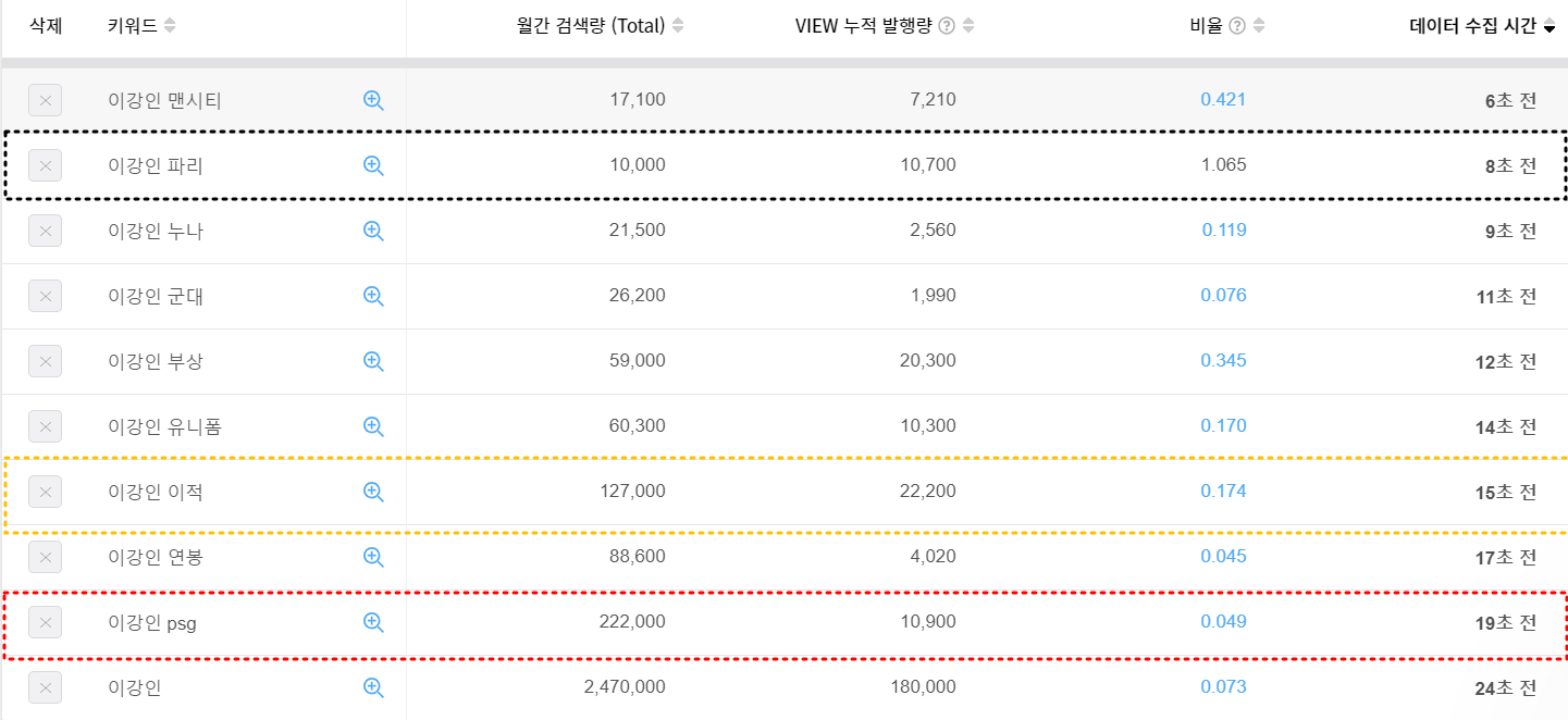 비율, 검색량, 누적 발행량 모두 이강인 PRG가 압도적으로 높습니다.