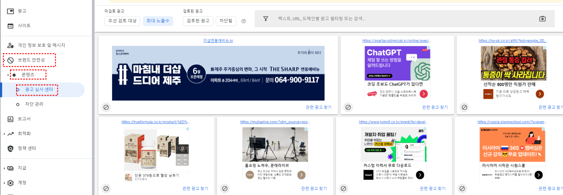 경로는 브랜드안전성 ▶ 콘텐츠 ▶ 광고 심사 센터를 클릭하면 아래와 같이 현재 개인 티스토리 게재광고들을 볼 수 있습니다.
