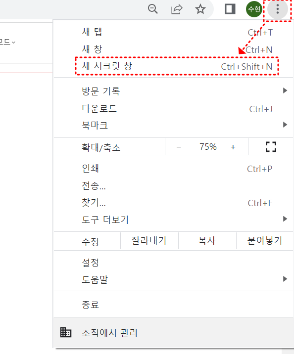시크릿 모드로 확인하는 방법은 윈도우 창 상단 점 3개를 눌러주시면 위와 같은 창이 뜹니다.